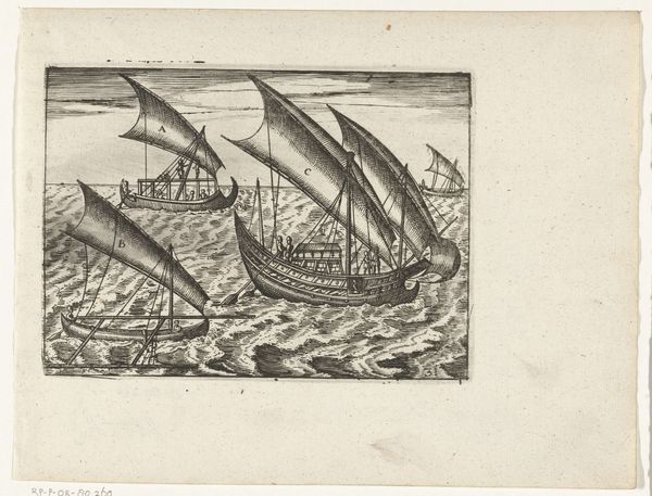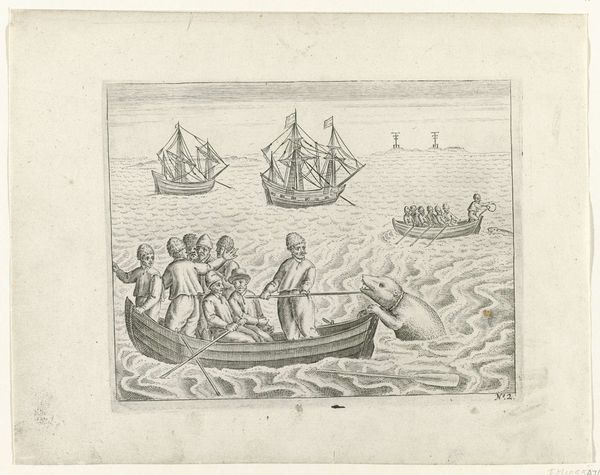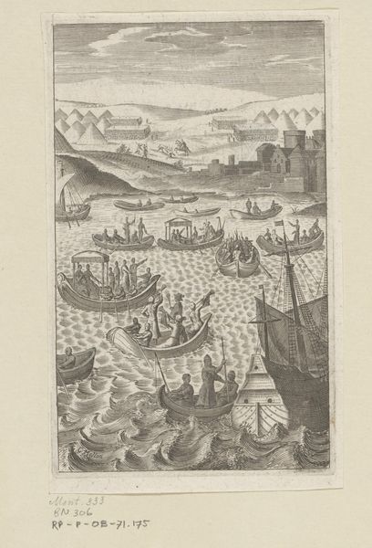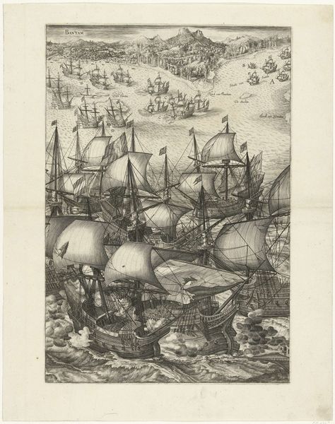 Curator: Daniel Rabel likely created this engraving, entitled "Zeegezicht met een eiland, schepen en een stad" which translates to "Seascape with an island, ships, and a city", sometime between 1588 and 1637. Editor: My first impression is drama; there’s a certain anxiety conveyed in the high waves, the leaning ship. It almost feels like a visual metaphor for the turbulent times, whatever they may have been! Curator: Indeed! Look closely at the engraver’s skill. See how he uses incredibly fine lines to build form and texture? You can practically feel the roughness of the sea and the way the sails billow in the wind. This wasn't just about capturing a scene; it's about the mastery over the material that creates such texture! Editor: And observe how Rabel incorporates elements of fantasy with more realistically depicted maritime elements, or the almost cartoonish plumes of smoke. Those ships on the horizon carry so much weight—ships appearing repeatedly in art from this period often stand as symbols of commerce, adventure, or perhaps something less tangible, like the human soul’s journey. Curator: Precisely! This reminds us how connected the prosperity of a region or even individual was at the time, deeply relying on international commerce and shipping. One printing plate could reproduce hundreds of these images. I wonder how this specific image informed or swayed viewers at the time. Was this for news, religious propagation, or perhaps more secular interest in travel and seeing faraway cities and scenes? Editor: Possibly all those things combined. Even a landscape or seascape becomes loaded with symbolism and aspiration, especially when representing foreign locales. That cluster of figures standing ashore – what does their presence signify in the grand narrative Rabel is spinning? Curator: A very good point! Consider what a process was required in production - drawing, etching, proofing - repeated actions where the intention could also subtly change! Editor: Examining the recurring symbolic language of seascapes allows a glimpse into past cultural values; here, that dialogue includes notions of faith, discovery, and human vulnerability when at the whim of nature’s power. Thank you for bringing forward these points today! Curator: Thank you for this intriguing outlook. The work now brings to the front new meanings.