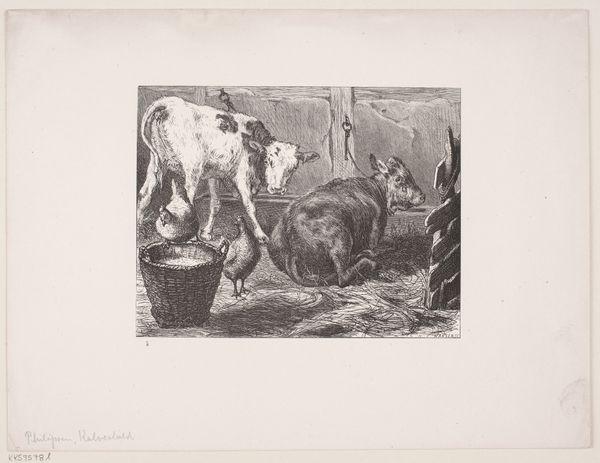 Johannes Wilhelm Zillen made this etching, "A Goat, a Kid and Rabbits in a Stable", at an unknown date. Zillen lived during a time of significant social and economic change in Denmark, with the rise of industrialization and urbanization impacting rural life. In this intimate scene, Zillen offers us a glimpse into the rural world. The animals huddle together, evoking ideas about domesticity and the family unit. The mother goat stands protectively over her kid, while the rabbits nestle together in a basket. Think about the maternal instincts of the mother goat and how this contrasts with the vulnerability of the rabbits. It is interesting to consider how class dynamics play out in relation to this depiction of rural life. Zillen, who came from an artistic family, invites the viewer to reflect on the relationship between humans and animals.