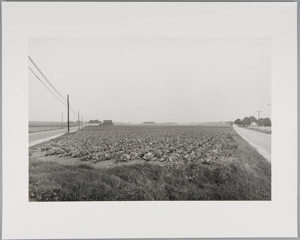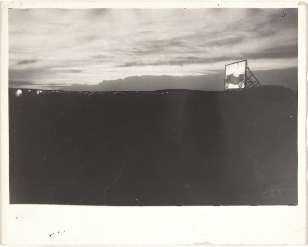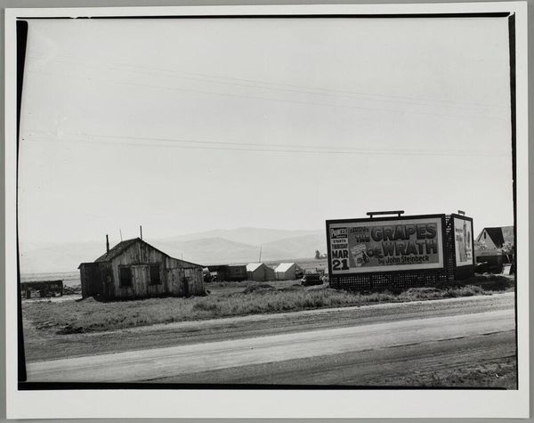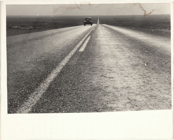 Curator: This is Robert Frank’s "Palmist--Athens, Alabama," a gelatin silver print from 1955. Editor: Right off, there's this palpable loneliness. The desolate road fading into the distance, that stark hand-painted sign, it all whispers of small towns and unspoken stories. It’s hauntingly beautiful, if beauty can be haunting. Curator: Absolutely. Frank's genius, especially during this period, lies in his ability to capture a kind of cultural anxiety brewing beneath the surface of mid-century America. It's post-war boom meeting an uncertain future. He does it with deceptively simple compositions, these glimpses into everyday life along the open road. You can see that especially well here, with a car parked off to the side and a sign indicating a “palmist”. Editor: It’s funny, though. The palmist seems almost accidental. Like Frank stumbled upon this scene rather than set out to document a fortune teller. It doesn't glamorize fortune telling at all. It adds to the grittiness. A counterpoint to a post-war cultural fantasy of wealth and an optimistic future. Curator: Exactly. Frank’s use of high contrast emphasizes that graininess, the lack of polish that other photographers at the time often avoided. What’s great about this particular photo is how that open road kind of calls you into it and beyond the immediate context of mid-century Alabama. Editor: Yes, there is something enduring here beyond the specifics of time and place. Frank, through this melancholic, grainy lens, offers something that feels perpetually human: this odd mix of hope and resignation, expectation, and an endless horizon. You wonder what futures are being sought on that roadside stop. It makes me wonder about our modern desire to control our destinies when there is so much just outside our control. Curator: Definitely food for thought. Ultimately, it's a poignant snapshot of a time, but also, timelessly, a study on the human condition and its uncertain path ahead. Editor: Well, if you’ll excuse me, that photo has convinced me. I’m off to find a palm reader! Curator: Ha! Best of luck. Let's just hope your future looks brighter than this photograph feels.