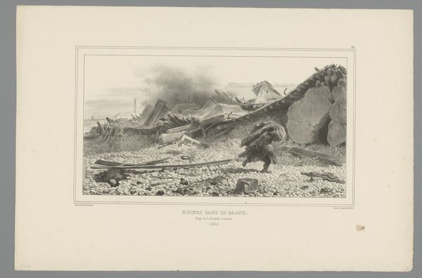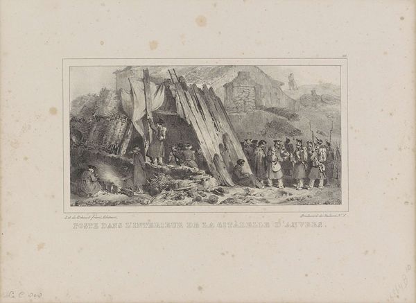 Editor: This is "French Camp, 1832" by Nicolas Toussaint Charlet, created between 1832 and 1833. It's an etching. It has this bustling feeling despite being in black and white and the tiny details – everything seems to lead your eye across the scene. What stands out to you when you look at it? Curator: What commands my attention is the linear quality evident in the etching technique. Notice how Charlet masterfully uses varied line weights to articulate form and create depth. The thatched bivouacs, for instance, are rendered with dense, almost frantic lines, suggesting texture and a sense of impermanence, while the figures are delineated with finer, more precise strokes, emphasizing their presence within this temporary space. Observe the structural logic informing the overall composition. How does the placement of the bivouacs in relation to the figures guide the eye? Editor: Well, the bivouacs seem to frame the soldiers, almost like they are props on a stage. And I suppose the darkness of the lines around them throws the activity around the fire into brighter relief. Curator: Precisely. The etching technique further accentuates these relationships. Notice how Charlet uses hatching and cross-hatching to create tonal gradations, giving volume to the forms and generating a dramatic contrast between light and shadow. How do these formal elements contribute to the overall feeling or message of the work? Editor: It creates an unsettled energy to it, the jagged lines. Perhaps it is a Romantic expression of conflict through form. Curator: Indeed, and considering Romanticism’s investment in notions of sublime, note also that the artist refrains from idealizing or romanticizing his figures, opting to depict the everyday lives and conditions of ordinary soldiers through starkly real lines. Editor: Seeing your analysis has taught me a lesson about how a "realistic" approach in terms of the line work could suggest so much Romantic feeling and expression in the theme and emotion. Curator: And hopefully you have inspired my own thoughts to wander. By attending to formal strategies evident, a doorway emerges to fresh observations.