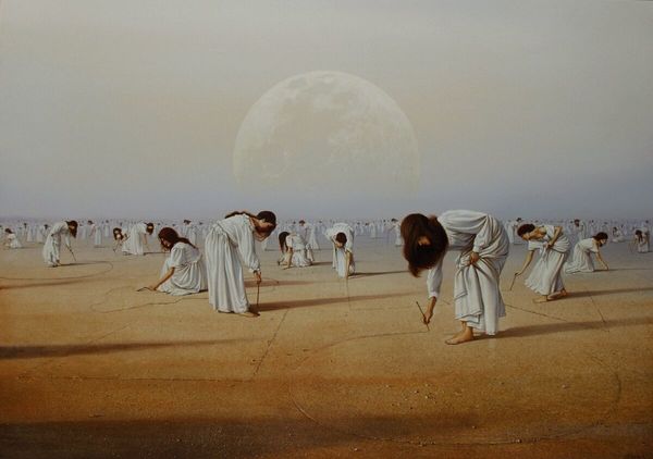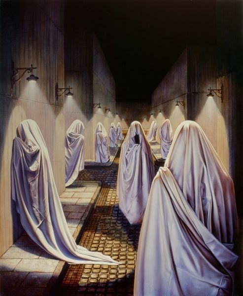 Editor: This is "La Lyra" by Siegfried Zademack, painted in 2017 using acrylics. It’s quite unsettling. All these figures draped in white, each holding a lit candle, stretching into the distance…what strikes you when you look at it? Curator: The figures' anonymity is fascinating. Their shrouds negate individuality, transforming them into manufactured units. What materials are in play beyond the acrylic on canvas, and what societal implications might they reveal? The ropes, the candles, even the ground they stand on, imply a labor, a manufacturing, that transcends mere artistry. How does the commodification of ritual contribute to the social order? Editor: So, you're saying it's less about the spiritual aspect of the candles and more about the process, almost like an assembly line of…what exactly? Are these ghost-like beings mass produced? Curator: Precisely! We're encouraged to consider production, the social hierarchy. The "fantasy" is constructed using tangible materials. Look at the ropes that bind some of the figures – they limit movement, enforce uniformity. We have to ask what system is making use of this group labor. Editor: It's interesting you highlight the material aspect. The robes appear like the figures are swathed in textile. Their connection to a specific industry. What are they making or being used for, who gains what? Is it then a statement on exploitation? Curator: Could it be read as a comment on modern manufacturing and alienation of labor? The materials of these "ghosts," robes, rope and the candle wax, hint at the broader cycles of creation and the people involved, seen and unseen. Does knowing it was painted recently alter your read of older practices being alluded to? Editor: It definitely adds another layer. It prompts a conversation about continued exploitation that echoes into the present day. Curator: I agree. Understanding the social implications embedded in even fantastical artistic creations can enrich our understanding and, I think, hopefully question it. Editor: I hadn’t really thought about approaching art from that angle. That helps me think differently! Thanks.