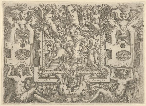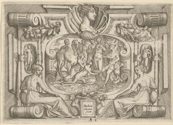 Curator: This engraving, "Judith and maidservant with the head of Holofernes, set within an elaborate frame," was created by Battista Angolo del Moro sometime between 1535 and 1585. The incredibly fine lines create a rather unsettling narrative, especially contrasted by the decorative elements of the frame. How does it strike you? Editor: The level of detail is impressive for what I imagine must be a pretty small print. It seems like so much labor went into this. I'm curious, what draws your attention when you look at this piece? Curator: Immediately, I consider the materiality of this print. Look at the process – the physical act of engraving those lines, the labor involved in the printing itself, the distribution of these images as a form of cultural capital. We are consuming the product of someone's intense labor and skill. Does the contrast between the violent biblical scene and the ornamentation interest you? Editor: Absolutely, the frame feels so detached from the central narrative, doesn't it? I suppose it's meant to elevate it, but... Curator: Or, is it to commodify it? These prints were objects traded and sold. Consider the historical context. Were they for private devotion, political commentary, or merely decorative? The frame becomes part of the object's appeal, increasing its marketability. Can you see how the contrast between the "high art" subject matter of religious history and the “low art” craft of printmaking starts to break down under that sort of analysis? Editor: That’s a really interesting point. It blurs those boundaries, certainly. So, the frame isn’t just decorative but almost a… sales tactic? A means of elevating the work within the context of the art market? Curator: Precisely. And think of the consumption involved – who bought this, how was it displayed, how did it circulate within society? Editor: It’s fascinating to consider art as a product of labor and consumption. I guess I usually get caught up in symbolism and forget about the hands that made it. Curator: And the systems within which those hands operate. Hopefully, you will always bring with you the question: Who benefits from this being made?