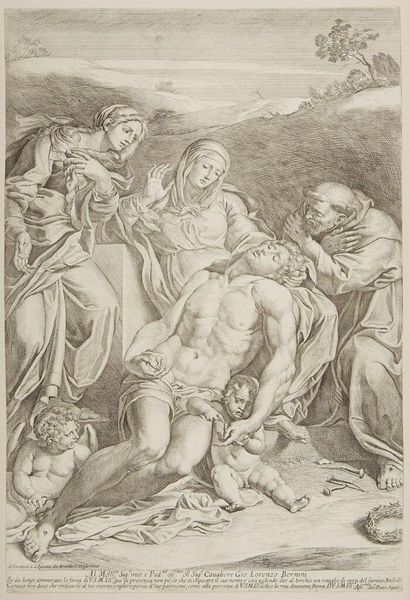 Curator: This is Battista Angolo del Moro's Pietà, held here at the Harvard Art Museums. Editor: It’s a striking image. The stark lines create such a somber mood, almost a raw grief emanating from the scene. Curator: The Pietà is a common subject, depicting the Virgin Mary cradling the dead body of Jesus. Del Moro presents a variation: Christ is surrounded by angels, with Mary standing behind, arms outstretched in anguish. Consider the political and religious turmoil of the era. Editor: The angels, usually symbols of comfort, seem overwhelmed. The image recalls earlier plague art, where angels are present but almost impotent against widespread death. Even Mary’s gestures seem to question divine intervention. Curator: Yes, and the etching technique, with its emphasis on line and shadow, heightens the sense of drama and loss. Del Moro's Pietà serves as a potent reminder of mortality, suffering, and the complex relationship between faith and human experience. Editor: It’s a powerful visual exploration of faith and despair—emotions that resonate even today.