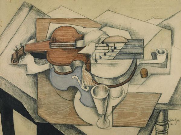 Curator: What do you make of this “Still Life With Guitar and Pipe” created by Henri Catargi in 1959? Editor: There's a subdued elegance. It’s very muted and still—almost mournful, even though it’s a still life! The gentle ochres and creams are lovely. Curator: I’m intrigued by how Catargi is engaging with cubist principles here, flattening and fracturing the familiar forms, while keeping everything firmly within the representational. He's abstracting the guitar, pipe, book, even the candlestick, but there’s no real confusion about what each object is. Editor: It's a domesticated cubism, perhaps? It feels so consciously modern but restrained—not making too much noise politically. You imagine it hanging comfortably in someone’s home, declaring good taste and quiet appreciation. What does it tell us about the artist and the time period? Curator: We see a clear continuation of certain modernist aesthetic preferences regarding geometric shapes, simplified forms, and symbolic object placement. In that sense, it reflects postwar attempts to recover, to rebuild not just structures but cultural confidence, finding solace and continuity through artistic expression. The pipe, of course, as a classic vanitas symbol, adds another layer. Editor: And the book as a vessel of knowledge... and the leaf? Why the leaf? It injects a needed element of freshness into the somewhat austere, academic composition, no? It whispers of the natural world and its inevitable decay. Curator: Indeed! It gives life and underscores themes of time and existence. It humanizes what could otherwise be a sterile exercise in form. Perhaps Catargi reminds us here that art's enduring power resides in its capacity to transform the mundane, such as a simple arrangement of everyday objects on a table, into profound and enduring reflections of the human condition. Editor: A nice encapsulation. Ultimately, a still and very graceful meditation.