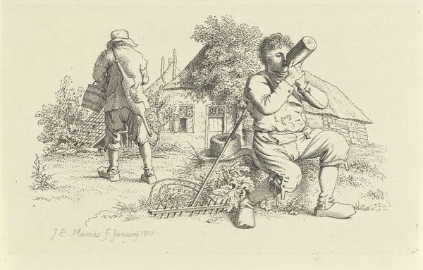 Curator: This watercolor drawing at the Städel Museum, credited to Hermanus van Brussel, portrays a farmer offering his produce for sale in front of a house. A dog sits on the lower left and a boy begging is off in the background. Editor: My first impression is of a carefully constructed moment, where shadow and light help frame the mundane. It possesses a quiet drama—a realism undercut by almost idealized forms. Curator: Van Brussel here appears to engage with genre painting. It allows one to analyze daily life. The slight atmospheric perspective and casual arrangement of the figures certainly suggests an interest in rendering the scene realistically, but maybe with a social commentary too. Editor: I’m interested in the watercolor technique itself, how the wash creates distinct planes of depth while losing details to give volume. Look closely, and the limited palette emphasizes the geometric solidity and the underlying structure. Curator: Yes, consider the era. The Dutch Golden Age experienced an increased merchant class and the establishment of marketplaces in the public sphere. This era generated many works showing such activities. It could show a moment in history and possibly its politics. Editor: I agree that contextual analysis would certainly support your arguments. The spatial distribution of forms draws your eye to the left, in the dark, then flows up and around toward the farmer's wares and figures in light, but in this light it creates volume within the scene. Curator: The drawing style itself seems almost antiquated now, doesn't it? These Dutch masters still have their appeal, offering windows into different societies and economies. Editor: Absolutely. And that combination of pictorial space with social realism—it’s why it remains such a visually compelling document for art historical purposes, still affecting how we approach visual strategies today.