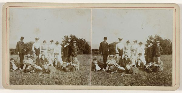 Curator: Here we have a group portrait of the Kessler family, taken in Homberg in 1902. The artist credited with the work is Geldolph Adriaan Kessler. It is rendered in photography and fits neatly within Pictorialism. Editor: There's something wonderfully ghostly about this image. It almost feels like looking at a gathering of spirits from a bygone era. The soft focus gives it a timeless quality, almost obscuring their humanity behind the aesthetics. Curator: Pictorialism valued artistic effect over pure documentation. It elevated photography to be on par with painting by prioritizing impression and subjective vision through specialized printing and darkroom manipulation techniques. So you see it in the dreamy quality achieved here. Editor: Yes, and notice how it also elevates the subjects' perceived status. These folks definitely understood how clothing materials signified rank, power, and financial status. Everything from the tailored suits of the men standing to the women's detailed hat constructions implies access. What material processes allowed such effects? Curator: Well, this family had built its fortune through iron ore and coal, and some worked in banks and railroads too. It also signifies an early era of mass image production which enabled broader audiences to collect and possess imagery than was possible before photography. Think about what a group portrait might mean at that historical moment. Editor: Absolutely! And I’m still struck by how it's presented – almost like a landscape view – as if humans are merely the most immediate ground layer. The dark lines of suits melt seamlessly into background, leaving very pale hands, faces and clothing to articulate emotional information. Curator: In terms of symbolism, notice the hats and dresses that the women wear that are meant to emphasize ideal characteristics during that time period such as their refinement. Notice too the grouping and arrangement, almost an unspoken ranking and family order displayed publicly for a social viewing. Editor: This work, in many respects, encapsulates so much about this particular historical moment, a powerful industrial elite asserting themselves. It provokes a multitude of thoughts about identity, consumption, and industrial progress. Curator: Indeed. The Kessler family portrait, with its almost ethereal treatment, reveals a nuanced intersection of individual portrayal and the construction of shared memory and ambition.