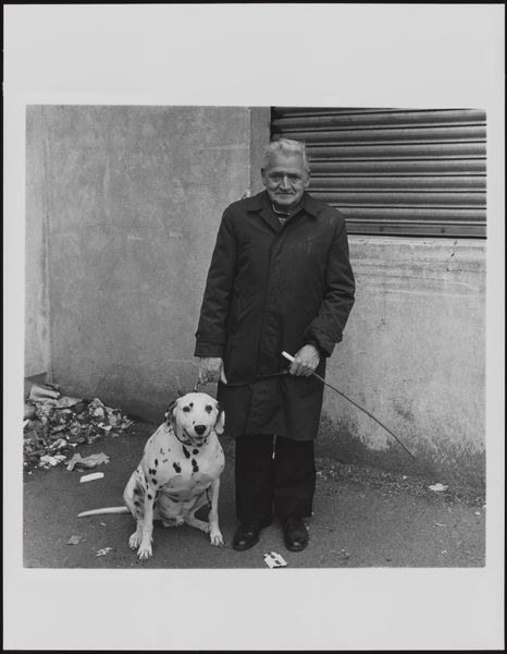 Curator: Look, this photograph, "Walking the Dog" by Keith Arnatt… it's not just a snapshot, is it? There's something so utterly…British about it. Editor: Utterly bleak, more like. The tonality alone suggests a post-industrial melancholia. Look at the grainy texture, the severe greyscale. Curator: But there's a quiet dignity, too. The woman's posture, the dog's expectant gaze… it's a story, but one told with restraint. Editor: Yes, and the composition – the woman is centered, almost symmetrically framed by the decaying architecture, emphasizing a sense of entrapment, perhaps? Curator: Maybe. Or maybe it's just about a woman and her dog, finding a little connection in a world that feels, well, a bit grey. Editor: Still, the visual language here speaks volumes, whether intentional or not. It's a fascinating study in the mundane. Curator: Exactly! It captures something essential. It's a reminder that beauty and meaning can be found even in the most ordinary of moments. Editor: I concede there’s something deeply affecting in its simplicity. A deceptively simple work.
