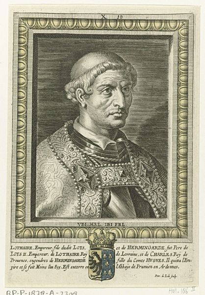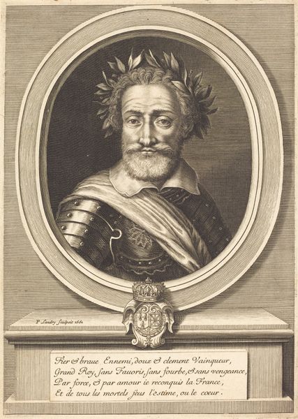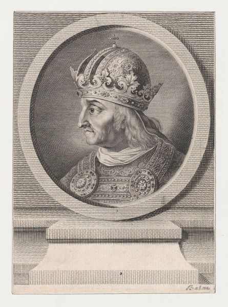 This is Jacques Kuyper’s portrait of Floris V, Count of Holland, made sometime in the late 18th or early 19th century. The print presents Floris within a carefully constructed oval frame, adorned with ribbons and laurel leaves, immediately formalizing the image. The use of monochrome engraving flattens the textures, reducing the dimensionality of the figure and emphasizing the intricate details of his regalia. Consider the structural balance here: the symmetry of the frame versus the asymmetrical arrangement of Floris's features. Kuyper employs a semiotic language of power, embedding symbols of authority within the very structure of the artwork. The details of his attire, from the feathered headwear to the ornate cloak, each element signifies a specific cultural code of status and historical identity. Notice how the artist uses linear precision to define the Count’s features, yet the overall effect is more symbolic than realistic. Kuyper doesn't merely depict Floris; he constructs an image of power, inviting us to decode its components and question its implications.