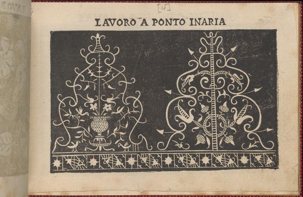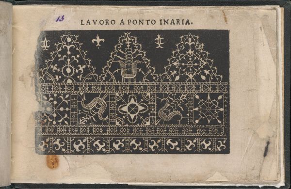 Curator: This etching, "Pretiosa Gemma delle virtuose donne," dating back to around 1600, showcases the exquisite designs of Isabella Catanea Parasole. It is currently housed at the Metropolitan Museum of Art. Editor: Wow, it strikes me immediately as meticulously architectural. I'm fascinated by how the dark engraving highlights the stark lines. You almost expect to find these designs adorning a building facade! Curator: Exactly! Parasole was renowned for her pattern books, providing designs for lace, embroidery, and other needlework—essentially blueprints for artisans of her time. Look closely at the patterns: the geometric precision contrasts with organic, flowing motifs. It’s this dance that truly enchants. Editor: What about the labor inherent in something like this? Each of these designs represents hours, probably days, of someone's skilled craft being poured into the work. The etching feels like it abstracts that labor, right? The design simplifies all of the intense work to make it feel simple when it is anything but. Curator: Absolutely. Each print was itself the result of labor! Then think about the labor these prints inspire, multiplying and shifting from graphic art, drawing, engraving, and printmaking to thread and cloth... Each repetition shifts the nature of its impact somehow. Don't you agree? Editor: Absolutely! Also, how accessible do you think it actually was for, say, working-class women to pick up these books? They might inspire more accessible or reinterpreted, altered, less-costly adaptations. That would probably change their use-value significantly! Curator: It is interesting to ponder that these prints themselves are tools! Like, imagine finding one of these. The transformation it takes is something like the chrysalis of potential it must hold for other craftswomen to realize and refine those visions of the book. Editor: To view art in this way helps us move beyond seeing just ornamentation! You realize you're seeing this long history and lineage of human hands shaping matter, refining tools, shifting across generations. Curator: It almost makes the patterns feel like secret messages now! Editor: In a way, they are! Thanks for a revealing look!