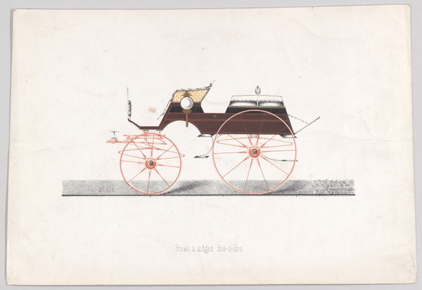 Curator: Look, there's an unexpectedly compelling image—"Design for Coach or Berlin/D'Orsay"—from around 1865-1875. Editor: Oh, how lovely! It has that dreamy, wistful quality like a forgotten photograph, rendered in graphite. Sort of like a phantom carriage in a minimalist dreamscape. What's its purpose? Curator: As the title implies, it's a design, meticulously rendered through drawing and printmaking techniques, proposing an elegant carriage design. One finds it now residing at the Metropolitan Museum. Editor: I see that—it has this quiet sense of precision about it, doesn’t it? It looks technically adept, all right angles and perfectly circular wheels. I find my eyes linger on the subtle textural variation in the carriage body, a captivating exercise in chromatic restraint. The crimson is also quite a clever touch! Curator: Agreed, the restricted color palette—graphite grays complemented by strategic crimson highlights—certainly amplifies the visual impact. I find this piece so interesting because of the visual paradox, the precision almost strips the object of warmth, yet I am fascinated by its stark composition. It speaks to the urbanization that gripped Europe at this moment in history. Editor: Absolutely, you’re spot on. I can imagine this dashing along the newly constructed boulevards of Paris. Is it that rationalizing spirit, that taming of the urban chaos, so powerfully embodied here? All those sharp, unwavering lines evoke a sense of ambition! The promise of movement, freedom even... albeit in bourgeois comfort, obviously. Curator: Precisely! Editor: Looking again at this work I am now aware of how many contradictions it holds, it is about transportation, but it's completely still; its line work is technical, but it hints at such luxurious refinement! So simple and straightforward and yet wonderfully deep... Curator: I feel, given what you say, we have unveiled an apt appraisal of this subtle drawing, something to carry with us for a time, at least.