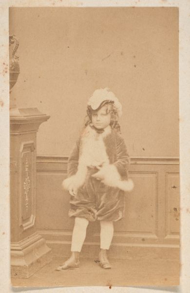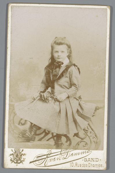Editor: So, here we have "Portret van een meisje, staand op een stoel" – a portrait of a girl standing on a chair – by Fr. Schulz, dating from 1860 to 1900. It’s a photograph, a sepia tone image of a young girl formally posed. There's a weight of expectation on her, or maybe that’s just how I read it. How do you interpret this work? Curator: That sense of expectation resonates. Looking at this portrait, especially its historical context, it’s difficult not to see the construction of childhood itself. Consider the power dynamics at play – the child, likely from a privileged background given the time period and formal setting, is being presented in a very specific way. How does the rigidity of the pose and the formality of her clothing speak to societal expectations of girls during this era? Editor: That's fascinating. I hadn't considered the clothing as a kind of constraint, reflecting societal expectations. I was so focused on her expression! Curator: Her expression is definitely key! What do you think the artist—or perhaps more accurately, the parents who commissioned the portrait—were trying to convey? Was it innocence, respectability, a display of social standing? Photography at this time was often about capturing a specific image, reinforcing certain social values. It raises questions about agency: the child’s, the photographer’s, the family's. Editor: It sounds like even something as simple as a portrait can open up conversations about so many different facets of society. Curator: Exactly. By engaging with these historical images, we can reflect on how norms and expectations have shifted, and how they continue to impact our understanding of identity and representation today. This photograph becomes more than just a picture; it's a cultural artifact. Editor: That's really given me a lot to think about. Thank you for sharing that. Curator: My pleasure. It’s always enriching to examine these historical representations through a contemporary lens.