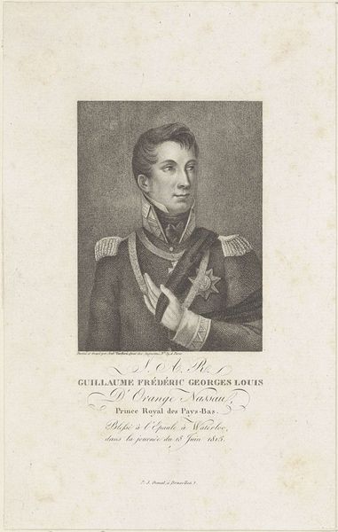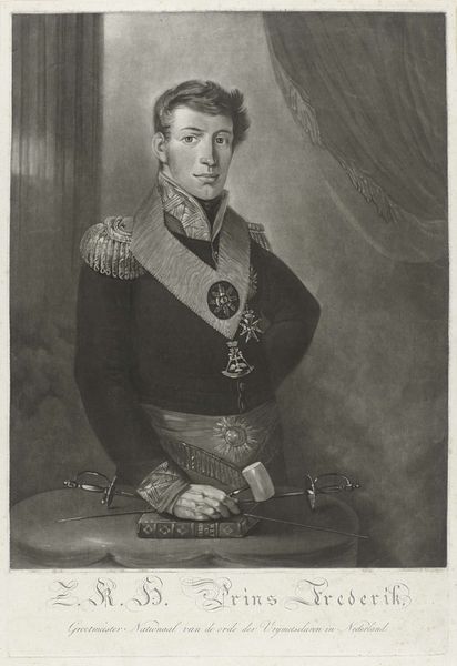 Curator: Oh, look, this engraving is quite striking. It’s called "Portret van Leopold I, koning van België," created in 1853. It’s an academic rendering of King Leopold I by Lucio Querino Lelli, and is clearly intended to project power. Editor: He definitely looks…severe. Like a headmaster about to scold you for a minor infraction. The monochromatic rendering gives it an austere, almost intimidating feel. Does it work, though? Or is it too heavy-handed? Curator: That severity might just be a sign of the times. Photography was in its infancy, remember, and formal portraiture—even printed like this—carried a lot of weight, meant to convey lineage and authority. Observe how the symbols around him become extensions of his personhood. Editor: Like the crown sitting casually to his side! It's almost comical, staged with the flair of Romanticism and history-painting. And those elaborate decorations! The stiff posture makes it all feel so…calculated. Did people really perceive Leopold I this way? Curator: Public image was everything! What is omitted tells us as much, right? Lucio Querino Lelli crafted this portrait within the norms of academic art to emphasize Leopold's role in the shaping of a young nation. It wasn’t just about likeness but about mythmaking. This portrait served to anchor Leopold I to the history books in very specific ways. Editor: True. It's all very official. Look at the detail in the engraving, though. It is beautiful, in a clinical way. And he almost looks exhausted... or is it world-weariness in those eyes? Curator: Perhaps both? Being king couldn’t have been a day at the beach! Anyway, it serves as an interesting marker in the history of both Belgium and printmaking, before photography started truly taking over this kind of formal portraiture. Editor: Well, I leave with a richer perspective on how rulers construct narratives. Art like this really underlines that for me. Curator: Yes, seeing him now really lets me ponder the ways historical context interacts with representation itself. A simple print unveils a nation’s very constructed persona.