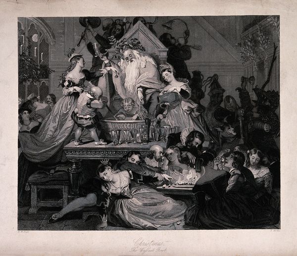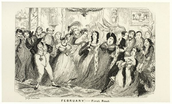 Curator: Well, here we have Gustave Doré’s pen and ink drawing, "Cinderella." Editor: It's overwhelmingly intricate, isn't it? Like a swarm of meticulously rendered figures fighting for space. I see opulence and almost frantic energy, appropriate I suppose, given the fairy tale’s inherent drama. Curator: Absolutely. Considering the socio-political context of the fairy tale and how it was deployed, Doré likely understood it as a narrative of social mobility. The detail he puts into the costuming here, each stitch practically visible, signifies status and the material markers of belonging. The labour involved speaks volumes about class. Editor: I am curious about the actual labor that went into producing this drawing, it had to be printed to be consumed widely, right? I mean, look at those cross-hatching techniques—incredibly precise, like an etching. I’m interested in thinking about this image not just as “art,” but as reproducible and circulated widely. What class was consuming it? Was it reinforcing ideals, or simply for pleasure? Curator: That's a crucial question. Doré was a master of illustration. His work for books meant this Cinderella wouldn’t be confined to a gallery; it infiltrated homes and shaped public imagination, particularly of the Victorian era. These images become deeply ingrained in the social consciousness and become the accepted, authorized version of events. The grandeur served a clear propagandistic function, almost! Editor: A very astute point! Doré’s medium really impacts the dissemination and understanding of "Cinderella". The line becomes this almost authoritative stroke, setting the scene for these romanticized ideals and almost fetishizing the accoutrements of the upper crust. He's selling not just a story but an aspirational lifestyle made achievable through magical, external forces rather than systemic changes. Curator: Exactly. The scale of production allows for immense social and cultural influence. The image's existence hinged on his labor, the printing process, and its access to bourgeois audiences wanting their ideals reinforced, or disseminated, rather. Editor: It's incredible how examining medium and accessibility deepens the social weight of the image itself, versus solely judging artistic merit. It definitely makes me rethink my first impression. Curator: Indeed, recognizing the intertwined relationship between fairytale imagery, art production and consumer culture transforms our perspective of this Cinderella forever.