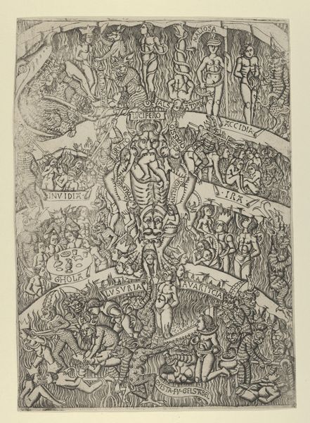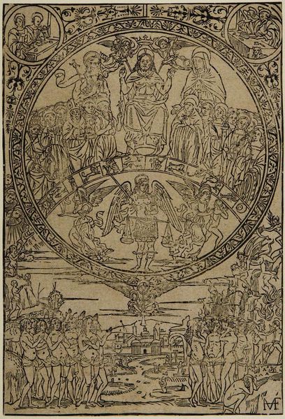 Editor: This pen and ink drawing is titled "The Last Judgement" from the 15th century, and we can see it on display at the Metropolitan Museum of Art. It looks so intricate and detailed, a lot of movement, but very static because of the lines, what do you notice in this drawing? Curator: The engraving demonstrates a fascinating commitment to line and form, even in the service of figuration. Note how the circular composition divides the earthly and divine realms and reinforces a structured sense of hierarchy. Do you perceive how the artist utilizes line weight to create a sense of depth, even in this flattened perspective? Editor: I see it now that you mention it, like how the figures near the center of the circle are bolder, is this emphasis on formal qualities also why some of the figures feel rigid or a bit awkward? Curator: Precisely. Observe that the goal here isn't perfect anatomical representation but rather the construction of a symbolic order through carefully calibrated visual components. What message is derived by the clear, bold division in composition? Editor: It almost feels as if this division of upper and lower reflects the weighing in the middle - a sense of judgement through line, form, and hierarchy alone, interesting. Thanks! Curator: A productive assessment! The work presents a clear case study in how formal considerations shape meaning.