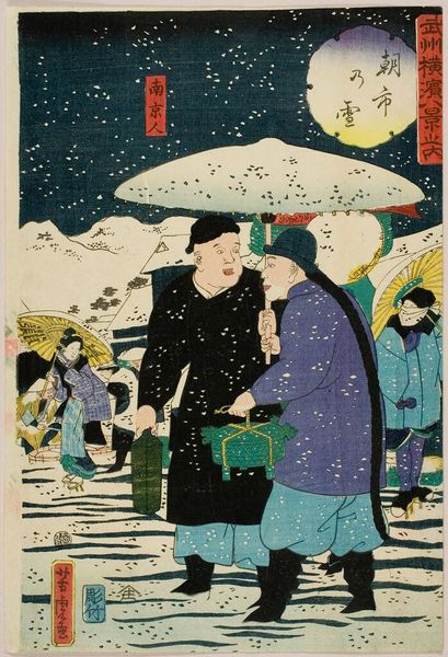 Curator: This is Utagawa Kuniyoshi's "Shin-Yoshiwara," from the series Famous Places of the Eastern Capital. I am immediately struck by the scale of the moon relative to the figures below. Editor: Yes, it's quite evocative. The texture, the woodblock print process, almost feels like fabric. The figures appear to be engaged in labor and leisure. Curator: Absolutely. The Yoshiwara district was a significant site, a pleasure district with complex social dynamics. Consider the figures; they are positioned as both observers of and participants in this carefully constructed world. Editor: Let's not forget the materials themselves. Woodblock printing allowed for mass production and dissemination, impacting the consumption and accessibility of art for a broader audience. Curator: Precisely. The print invites us to consider the intersection of class, gender, and the performative aspects of urban life in Edo-era Japan. Editor: It's the marriage of the printmaking process with the human figures that really brings it alive for me. Curator: Indeed, and examining that connection gives us a deeper look into the social complexities of the time.