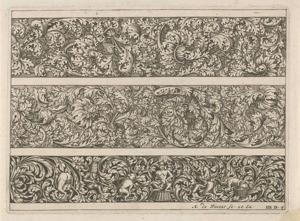 This is a print of three friezes with leaf tendrils by Anthonie de Winter, made around the late 17th century. The abundant foliage speaks to a long tradition of decorative arts, symbolizing vitality, growth, and abundance. Consider the leaf tendrils themselves, echoing back to classical antiquity, where acanthus leaves adorned Corinthian columns, signifying prosperity and endurance. Now, observe how these motifs weave and intertwine, not merely as decoration, but as living, breathing elements. This visual language resurfaces during the Renaissance, with the rediscovery of classical forms, embodying a renewed appreciation for the natural world. These botanical forms touch something primal, don’t they? The tendrils, reaching and grasping, evoke a sense of striving, an unconscious desire for connection and growth that resonates even today. In the 17th century, in Dutch art, we find a burgeoning interest in botanical illustration, reflecting a cultural fascination with the natural world. Through time, this dance with nature—this dialogue between growth and decay—continues, finding new expression with each era, bearing witness to our collective, and ever-evolving, relationship with the world around us.