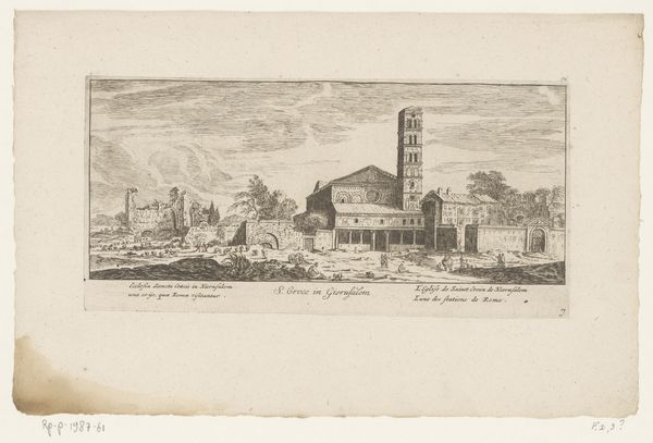 Curator: Well, what jumps out at you immediately? Editor: A melancholy grace. This etching has an antique sepia tint, showing ruins, crumbling architecture, under a vast, faded sky. The skeletal remains of grandeur...it speaks of loss, doesn't it? Curator: Indeed. This is Henry Chapman Ford’s 1883 etching of the Mission San Juan Capistrano. Ford was a very interesting character, leaving his mark with paintings and prints depicting the California Missions. Editor: A history painter with a romantic heart, it seems. Those arches...they are almost Roman in their decay, a broken aqueduct transported to the New World. I suppose the arc is one of humanity’s oldest symbols of striving, spanning the divide. Curator: He really captures that sense of temporal tension, doesn’t he? This work really stands at the crossroads between documentary and nostalgia. You have the artist drawn to the missions’ history—these grand religious outposts transformed by time and neglect, under an uncaring, even oblivious sky. Editor: Oblivious, maybe...but the heavens are usually never uncaring. Notice the little birds there. They imply presence, divine even; the persistence of life even amid the stones’ steady fall back to earth. Ford gives weight to absence here. Those arched doorways invite shadow. What happened here? Curator: Well, it served as an important religious and community center for decades until an earthquake devastated it in 1812. Editor: Ah, a natural force. It speaks to something elemental—earth's reclaiming of the imposed order. The print captures a landscape scarred yet enduring. I keep wondering about the people who built these stone and mortar dreams. Did they imagine birds nesting in their rafters one day? Curator: Hard to say. I suspect, though, that Ford certainly appreciated this visual irony and symbolism. Editor: Absolutely. There’s a potent sense of place. What remains whispers across time... a fragile, haunted beauty, yes, tinged with sorrow, and also, hope, in the endurance and silent promise. Thank you for sharing this visual meditation with me! Curator: My pleasure! Always great to unpack these layered stories. It really is one of the strengths of such detailed etching work. It reminds us to consider multiple viewpoints in even the most familiar landscapes.
