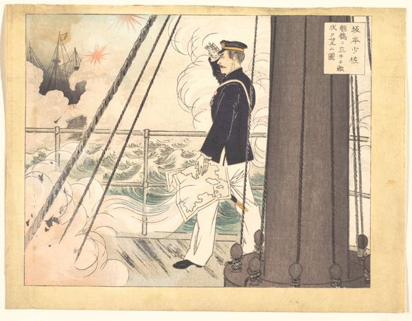Curator: Here we have “War Hero: Our Captain Lieutenant Hirose Takeo” created in 1904 by Ôkura Kôtô, housed right here at the Rijksmuseum. A fascinating piece of mixed media using watercolor and colored pencil— with print techniques, might I add— to achieve this dynamic rendering. Editor: My word, talk about drama! It’s like a snapshot of sheer panic. That figure leaping amidst the chaos... it’s almost operatic, wouldn't you agree? Curator: Exactly! Ôkura captured that raw emotion of the Russo-Japanese War in such a theatrical way, highlighting Hirose Takeo's dramatic courage under fire. What seems a maelstrom, even in those cool tones and blended techniques. The darks are offset with a distinct movement from right to left. It suggests a narrative almost defying its two-dimensionality, and seems highly evocative of ukiyo-e traditions in woodblock printing Editor: But it's not just action for action’s sake. Look at how Ôkura frames Hirose’s figure against that blinding explosion – the light rendering him vulnerable despite his bravery, right? It speaks to a certain ambiguity about the glorification of war, even whilst participating in its very glorification. Curator: That’s precisely what makes this work so compelling. There’s a tension between the subject's heroism, the obvious intention, and a sense of impending doom—that splash of muted palette, for instance. Do you find the layering significant to that end? Editor: Well the composition's all jagged edges and disrupted planes. So yes! Definitely reflective of an anxious modernism with that Japonisme aesthetic. Everything tilts; there's hardly any repose for the eyes! You sense a cultural moment on the cusp of massive shifts through pure form. Curator: Perhaps it reflects the chaos that resides both within and outside us. And Ôkura, so early into a modern aesthetic movement, captures the visual culture's energy... that transition from ukiyo-e into something reflective of Western artistic sensibility... It all resonates so powerfully across the years. Editor: Ultimately it shows us the eternal struggle of individual heroism, cast against the brutal backdrop, don't you think? And I rather appreciate how it is also simply a document from its time in our museum!