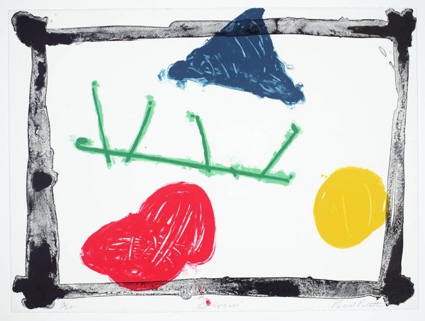 Curator: Patrick Heron's "Interlocking Scarlet and Pink in Deep Green: April 1970"—such a playful title for a print teeming with chromatic energy. I find that title to be quite a tongue twister to be honest! Editor: It feels like a coded map of desires, doesn't it? A radical challenge to the austerity of the late sixties with those interlocking shapes, suggesting a dance of bodies, histories, and political movements. Curator: Absolutely! The tension between the scarlet and pink against that deep green is almost electric, sparking a dialogue that tickles the senses. Editor: That deep green isn't just background, it's a fertile ground for the pink and scarlet to erupt, mirroring the radical shifts happening in society, and perhaps even nature itself. Curator: Mmm, I see it as a reminder that art can be both intellectually stimulating and a pure, visceral joy. Editor: Precisely. Heron provides a visual language for a time of great change, and invites us to think more on the changes that we are still experiencing.
