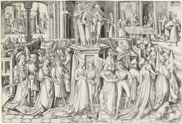 Israhel van Meckenem created this print, "The Dance at the Court of Herod," around 1490, using engraving to render a complex scene with remarkable detail. The composition is structured by a foreground filled with dancing couples, a middle ground featuring musicians on a raised platform, and a background where Herod’s banquet unfolds. Van Meckenem uses line to define forms, creating a textured surface where patterns of light and shadow articulate the scene's depth. The organization of figures across the space suggests a deliberate attempt to represent social order. The architecture imposes a formal structure that contrasts with the figures’ more relaxed postures and costumes, perhaps destabilizing the notion of fixed social hierarchies. The print presents an interpretation of social interactions, using symbolic visual codes to explore themes of order, pleasure, and their inherent instability. These interpretations are continually evolving and contested.