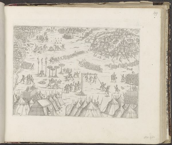 Editor: Frans Hogenberg’s "Aftocht van Spanjaarden uit Antwerpen, 1577," or "Departure of the Spanish from Antwerp, 1577," an engraving dating from around 1577-1579. The scene depicts a large group of figures departing a city, with quite some attention given to landscape. What do you make of this imagery? Curator: The image’s historical significance lies in its depiction of the Spanish army’s withdrawal from Antwerp, a key event in the Eighty Years' War. Its publication as a print indicates the proliferation of political imagery in the 16th century, intended to sway public opinion and document crucial moments in the conflict. What effect did you think that might have had on the views of people at the time? Editor: I suppose it allowed a larger amount of people to become politically aware, although with inherent bias. It does make me wonder about its authenticity, though. How might the image contribute to the construction of a particular historical narrative, versus offering a simple accurate view? Curator: That is indeed one of the key issues to consider! This image served a propaganda function, glorifying the rebels' victory and demonizing the Spanish. Note how the composition directs the eye away from the city, emphasizing the retreating army. The orderly layout and clear depiction of events create an impression of Dutch strength and Spanish weakness. So the ‘reality’ may be slightly skewed. Editor: That makes a lot of sense. I guess I hadn't quite appreciated the extent to which this image is ‘editorialized,’ for lack of a better word. It definitely shapes your perception, knowing this. Curator: Precisely. The public consumption of art was directly linked to political power and national identity during this turbulent period. Reflecting on its place in that context deepens our understanding of its artistic intentions. Editor: Thanks, I will definitely remember to explore art through historical narratives and institutional motivations from now on.