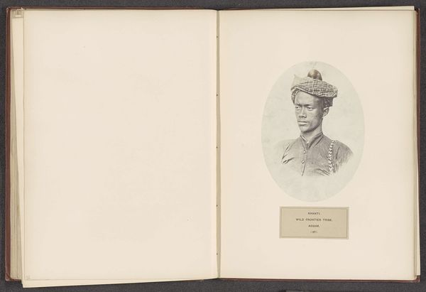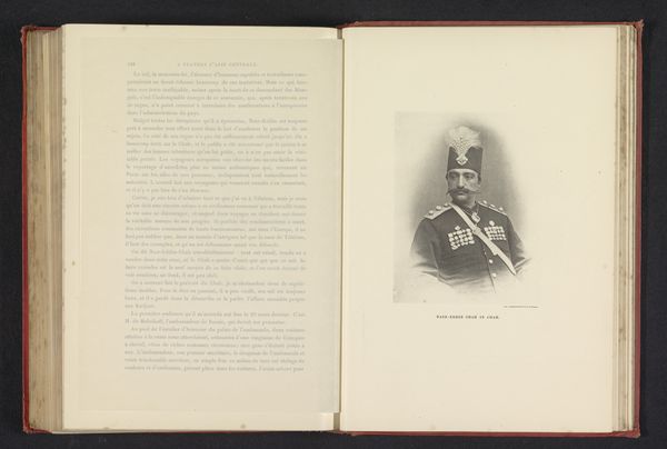 Curator: Before us, we have a photo reproduction dating back to before 1897, a portrait of Wilhelm I at 48 years old. The medium is a print on paper. What strikes you upon first glance? Editor: The crisp, clean lines of that ruled border he’s imprisoned in makes me think of official documentation – the weight of history pressing down. You almost feel bad for the guy; but, hey, at least he's looking sharp. Curator: Indeed, the sharp definition throughout the image underscores its character. Let's note the delicate typography beside the plate, clearly distinct on the facing page within what appears to be a carefully assembled volume. The piece exhibits characteristics of neoclassicism within portraiture, highlighting structure and order. Editor: Exactly! Like he's presenting himself to the history books. But beneath that starch, is there some human emotion peeking through? The texture of the paper looks really rough, sort of clashes with the rigid feeling... Curator: I would venture to say there is a calculated degree of austere nobility in the portrait that reinforces rather than dispels his regal status. The materiality contributes further context. The aged quality of the paper stock enhances our understanding; given that photography at this period was ascendant, what meanings are created, exactly, when the photographic image is rendered with a look redolent of much older graphic reproduction techniques? Editor: Maybe it's trying to solidify his image in a longer history, making him part of a lineage? Also, what about the faint hand-drawn typeface they use in it. It's so delicate, and personal – what contrast that provides, an almost intimate note inside this grand presentation. It gives the whole thing more depth and mystery, somehow! Curator: Your insights spark my interest in considering what seems at first as representational in relation to those hand drawn elements and that impression of aged paper. Thank you for guiding me toward such perspectives. Editor: And thank you; this photograph whispers fascinating ideas; art historical awareness enriches our appreciation of even simple objects, such as a photograph on aged paper!