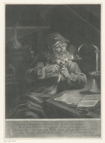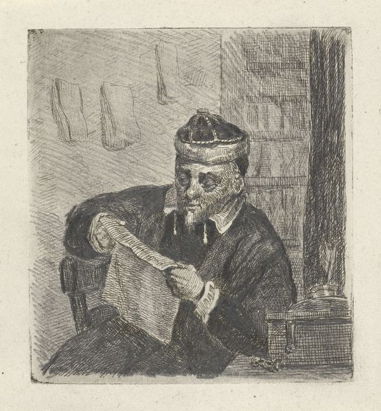 Salomon Koninck created this etching, Man with a Penknife, in the Dutch Republic during its Golden Age. The image shows a man with a long beard, wearing a beret, and carefully sharpening his quill with a penknife. He is surrounded by books and other scholarly objects, like the hourglass, and a wall-mounted grotesque head. In the context of the Dutch Golden Age, a time of great commercial expansion and social change, this image speaks to the important cultural value placed on literacy, knowledge, and scholarship. Koninck was not working in isolation; he was part of a wider artistic milieu. While his style wasn't as flamboyant or dramatic as Rembrandt's, it was still very much influenced by it. By looking at the institutional contexts in which he was working, we can better understand the social function of his art. Researching the inventories of private homes and public institutions can help us understand the value placed on such images at the time and the possible social implications of this etching.