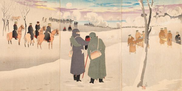 Editor: This is "Seller of Bonden" by Katsuhira Tokushi, a vibrant print of a person selling colorful toys in the snow. It seems to capture a moment of everyday life, but I wonder, what's the story behind these *Bonden*? Curator: These *Bonden* likely had a specific cultural significance. What role did street vendors play in the social fabric of the time? Were these toys for children, or did they have a ritualistic purpose? The way the vendor is depicted, consider the visual language. How might socio-economic status be communicated through dress and posture? Editor: So, the image is not just about a person selling toys, but also possibly a reflection of social dynamics? Curator: Precisely. It invites us to consider the public role of art and the subtle politics embedded within seemingly simple scenes. What is made visible, and for whom? Editor: I see, thank you for pointing that out.