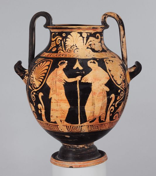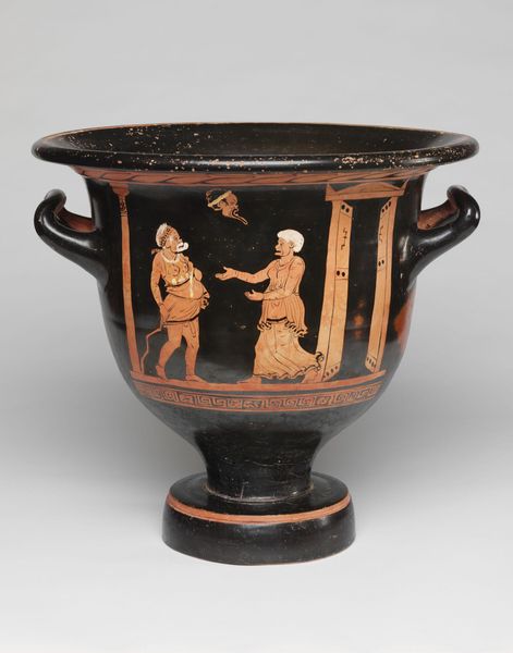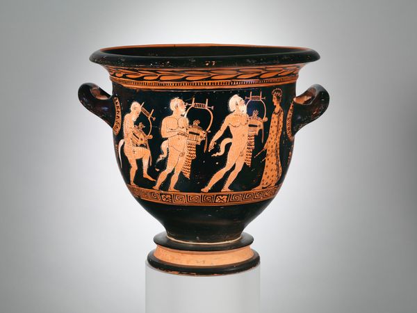 Curator: This Calyx Krater, or mixing bowl, is attributed to The Nikias Painter. Notice the intricate figures painted onto its surface, showcasing an exotic dancer. Editor: Immediately, I'm struck by the rhythm of the figures. It’s as if the bowl itself is pulsating with music and movement. There's something incredibly joyful about it. Curator: Indeed. The composition is quite deliberate; the dancer’s pose creates a dynamic tension, balanced by the static figures surrounding her. Note the use of positive and negative space created through the red-figure technique. Editor: It’s interesting how the limited color palette actually heightens the sense of drama. The red clay becomes flesh, the black background a kind of shadowed stage. The dancer’s spotted costume only adds to the playful subversion. Curator: Precisely. This piece exemplifies the cultural narratives of its time through its formal characteristics. Editor: It really makes you wonder about the stories these objects could tell, if they could talk. The life, the parties, the laughter they witnessed. Curator: An intriguing point, well, let's leave our listeners with that.