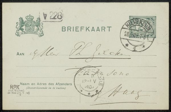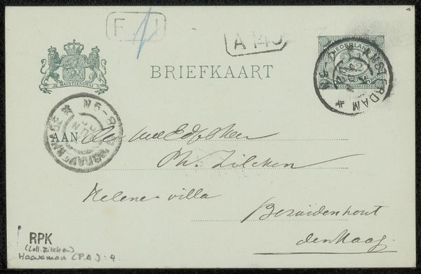 Editor: This is "Briefkaart aan Philip Zilcken," or "Postcard to Philip Zilcken," thought to be from 1906, by Anton L. Koster. It seems to be a drawing reproduced as a print on paper. It's visually quite busy with handwritten text, stamps, and seals. What elements stand out to you most in this work? Curator: Immediately, the structural tension between the rigidity of the pre-printed postcard layout and the expressive freedom of the handwriting compels attention. The deliberate placement of each stamp, seal and address contributes to an interplay between formal design and personalized communication. Note the density of visual elements and how the eye struggles for focus – it's a calculated field of visual energy. Editor: I hadn't considered it that way; I was more drawn to the somewhat faded quality of the inks. Does the aging of the paper or ink impact your formalist reading at all? Curator: Intriguingly, the degradation becomes integral to the form. It introduces an element of chance and decay. The blurred seals and faded writing introduce indeterminacy to the composition. What once might have been pristine now exists in a state of constant flux, becoming both a historical record and a meditation on ephemerality. Editor: That's a perspective I hadn't fully considered. The idea of deterioration adding to the artwork’s essence is fascinating. Curator: Indeed, and by considering it from a purely structural standpoint, one begins to understand the work on a deeper, almost philosophical, level. It makes you wonder, doesn't it? Editor: Absolutely. It's like seeing the artwork not just as an object but as an evolving system.
