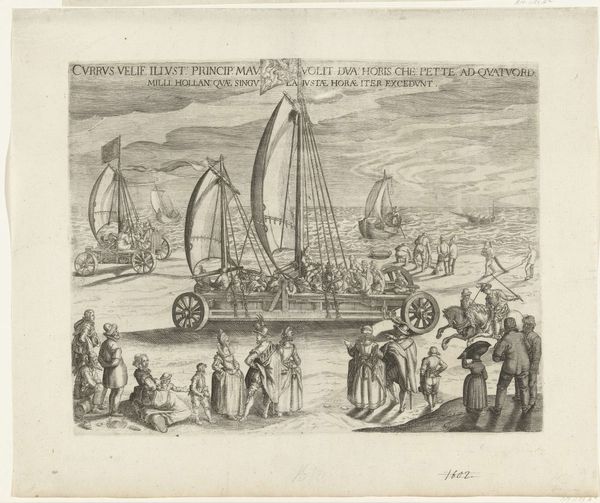 Willem van Swanenburg created this engraving, "Zeilwagen van Simon Stevin," around 1602, a time of significant transformation in the Dutch Republic. It captures the spirit of innovation during the Dutch Golden Age, as well as the hierarchical nature of the society that enabled such inventions. The artwork depicts Simon Stevin's wind-powered carriage, a marvel of engineering, transporting members of the elite along the beach. The presence of nobles and dignitaries underscores the social stratification of the time, highlighting who had access to technological advancements. The emotional resonance of the piece lies in its depiction of human ingenuity and aspiration. Swanenburg's engraving not only documents a technological achievement but also reflects the socio-political landscape, revealing the era's fascination with progress. It also speaks to the ways in which status and power were intimately connected to scientific and technological endeavors.