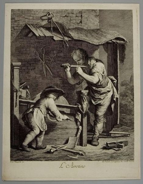 Curator: Let’s look at "De messenslijper", or "The Knife Sharpener," an etching and engraving by Giovanni Volpato, dating somewhere between 1743 and 1803, and currently held in the Rijksmuseum. It presents a detailed scene of a craftsman at work. Editor: My immediate impression is the incredible detail. It feels gritty, you can almost hear the grindstone and see the sparks flying, even though it’s static. It captures a moment in the work life of its subject with authenticity, emphasizing labor as the dominant attribute of being in this world. Curator: Absolutely. And consider the social implications of such a representation during that period. Genre scenes like this began to democratize art, shifting focus away from strictly aristocratic subjects to portrayals of everyday life. How did this shift change who the audience of art was? It made space to highlight laborers like these two figures, lending a sense of dignity. Editor: Right, the dignity of labor is really the heart of this artwork. You can see it in the precise rendering of the grindstone itself and the tools scattered on the ground. It speaks to a relationship with material—the labor and care that shapes our interactions with physical objects. I think we can extend this idea to the paper making process of print making as well. Curator: And the division of labor implied by the figures in the image is worth unpacking, too. A grown man who inspects and tests, presumably the leader, and a younger boy toiling and performing repetitive motions, under a rather crude makeshift roof. How might power dynamics manifest and normalize through material division? Editor: That tension is present, isn’t it? While it's a snapshot of work, it's also subtly commenting on its inherent social structures. I almost feel the grit in the boy's face as he turns the wheel. Volpato clearly demonstrates the direct result of physical involvement on their characters. Curator: Agreed. Considering it now, this piece shows the material conditions of artistic expression intersect deeply with class and societal inequalities. Even a seemingly simple depiction of work speaks to so much more when contextualized historically. Editor: Exactly. And by focusing on these tangible elements, the materials and actions depicted, we can build bridges between high art and the world of ordinary experience. A compelling way to highlight those who make our existence possible.
