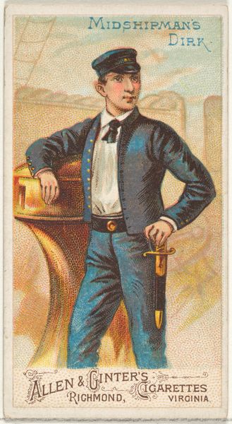 Curator: Isn't this captivating? Here we have "Number 24, Metempsychosis," a piece hailing from 1887 by W. Duke, Sons & Co. It's actually a print, part of the "Tricks with Cards" series designed to promote Honest Long Cut Tobacco. Editor: My word, what a delightful bit of whimsy! It’s like peering into a stage magician's daydream, with its art nouveau sensibilities and its colour-penciled magician conjuring birds out of thin air... a narrative ripe for the picking! Curator: Precisely. These trade cards were, of course, commercial objects distributed to boost tobacco sales. However, it is interesting how they also provided a glimpse into the popular imagination, particularly concerning entertainment and the burgeoning interest in magical illusions at that time. It suggests that Honest Long Cut was attempting to position itself as purveyor of something special—a little bit of everyday magic. Editor: Everyday magic, yes! The composition, despite its commercial function, speaks volumes. The slight of hand, the focused gesture… it feels… hopeful. And look at how the colours dance—they’re not quite realistic, but they hum with potential. What do you think he might materialize, from our humdrum reality? A new dream? A wish fulfilled? Curator: One could argue that the means of production here – printmaking, colored pencil drawing – cheap yet decorative methods – reflect both the widespread consumption patterns and social status connected to tobacco usage. The 'trick' itself is a symbolic promise mirroring consumer culture. Editor: I can almost smell the sweet scent of pipe tobacco now, hanging in the air along with anticipation... You are quite right! Every consumer is expecting, yearning, some transformation. Curator: Yes. It demonstrates that beyond its aesthetic charm lies the heart of marketing and sales strategy deeply linked with societal beliefs. Editor: In the end, that intersection, between belief, desire and object… is, I suppose…its own magic.