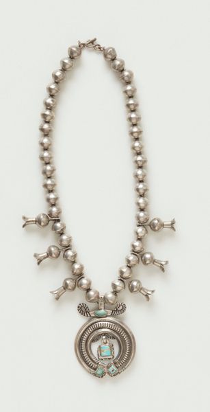 Editor: We’re looking at a necklace, made around 1930 by a Navajo artist. The materials are primarily silver. The piece strikes me as delicate, almost like frozen droplets of water strung together. What are your initial thoughts looking at this, knowing the context? Curator: The first thing that stands out to me is the context of its creation. The 1930s were a time of significant socio-political upheaval, especially for Indigenous communities in the United States. This necklace wasn't just a decorative object; it represented cultural resilience and adaptation within a system that often sought to suppress Indigenous expression. Editor: Adaptation in what way? Curator: The use of silver, for example, reflects both tradition and a response to new materials introduced through trade and economic pressures. Silverworking became a vital economic outlet for Navajo communities. The popularity of "Indian arts" was simultaneously empowering and fraught with the challenges of appropriation and commodification. Consider the demand for such pieces coming from a burgeoning tourist market versus the cultural meaning imbued within the Navajo community. Editor: So it's walking this tightrope between cultural expression and a kind of commercial performance? Curator: Precisely. This is where we see the negotiation of identity taking place through the act of creation and presentation. Think about who was buying and wearing these necklaces. It says as much about the wearer and their motivations as it does about the artist. Editor: I hadn’t considered the complex consumer relationship involved! Curator: What initially appeared delicate is really an assertion of identity and a form of economic survival. Looking closer, we begin to question the entire power structure surrounding the creation and reception of Indigenous art. Editor: This makes me see it less as delicate and more as… purposeful and strong. Thanks for this fresh perspective.