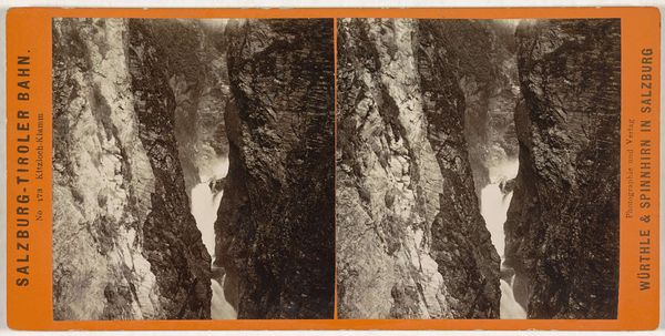 Curator: Before us, we have a stereoscopic photograph titled "Gezicht op de Reichenbachwaterval," which roughly translates to "View of the Reichenbach Waterfall," attributed to Florentin Charnaux, taken sometime before 1880. The photograph uses a dual image technique common at the time to create a 3D effect when viewed through a special viewer. Editor: The overwhelming impression is one of raw power, almost deafening. The sheer scale of the rocks dwarfs everything else, focusing your eyes on the cascading torrent of water. I feel a strong pull between the solid, fixed earth and the transient, ever-changing flow. Curator: Absolutely, the contrast is central to its visual language. Observe how Charnaux employs light and shadow to sculpt the rock face. The lines, almost geological strata, are incredibly dramatic, directing your eye upward to the cascade. Notice also, the limited tonal range. It almost creates a sense of timelessness, divorced from specific conditions. Editor: And look at those rocks themselves! The texture screams out; I imagine they were painstakingly cut and shaped. Where did the material come from? What processes transformed these geological forms, ready to be transported? The photographic material, the plate, its chemistry; that's where the labor comes in, from the harvesting of raw material to the precise and potentially dangerous work of its making. Curator: Indeed. However, focusing primarily on form, consider the waterfall's almost abstract quality. The movement is cleverly captured by Charnaux— a blur against the solid geometry of the stone. It raises interesting questions about photographic representation, specifically how a single still image attempts to arrest the flow of time. Editor: I am really considering how photography was disseminated at the time. Mass produced images such as these changed how people could engage with images. They had new means of documenting and possessing an image of the landscape for instance. The availability of these works changed how consumers engaged with craft. Curator: Your emphasis on consumption is fascinating! In closing, looking at the overall composition, Charnaux successfully delivers an immersive experience of natural wonder—one framed within an engaging discourse of light, form and representation. Editor: And, for me, a stark reminder of our constant reshaping of natural resources, both materially and through how we circulate images of our own creation.