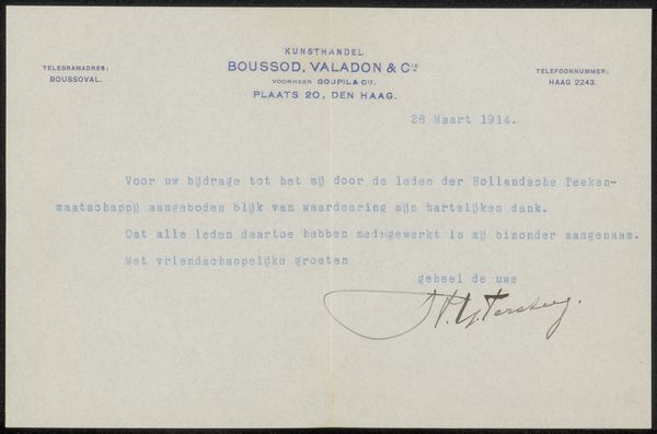 Editor: This drawing, "Brief aan Pieter Haverkorn van Rijsewijk," possibly from 1913-1919 by J.A. de Wilde, presents a formal letter. I’m struck by how much personality comes through in the handwritten font; it feels both official and quite intimate. How do you read this piece? Curator: This letter embodies a fascinating intersection of authority and personal expression through the visual language of text. Look closely at how the letter-forms play with established conventions. Do you see how certain strokes thicken and swell, hinting at a deeper emotional current beneath the surface formality? The act of handwriting itself, especially in a formal context, can be a deliberate symbol of the self. Editor: Yes, I see that tension now. The layout is very structured, almost like a template, yet the script itself introduces a very human element. Does the specific type of script used carry any cultural meaning? Curator: Absolutely. Consider how calligraphy, and even more utilitarian handwriting styles, were once markers of social status and education. Notice the almost calligraphic flourish in the signature— a claim to identity, an assertion of presence, even within a somewhat constrained professional context. In the act of writing, the writer is recreating selfhood as a physical reality. What kind of legacy would that generate? Editor: That's fascinating, the idea of a performative self being created with each stroke. It makes me think about how we use fonts today to convey similar things in digital communication. I never would have thought to look for such subtle expression in what seems like a standard business letter! Curator: And that is the power of images—how they encapsulate cultural memory and values through seemingly simple forms, echoing across time.