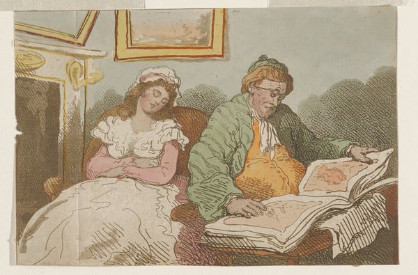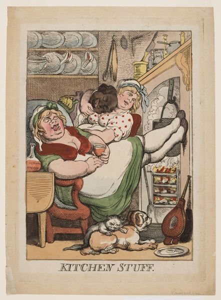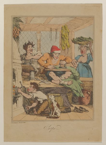 This hand-colored etching, crafted by Nicolaus Heideloff, encapsulates the daily tribulations of human existence through a chaotic scene in a tailor's workshop. Note the cucumber seller at the window, her shriek disrupting the industrious activity within. The cucumber—a seemingly humble vegetable—takes on symbolic weight here. Consider its historical presence, stretching back to ancient civilizations. In some cultures, the cucumber represented fertility and abundance, while in others, it was associated with coolness and healing. However, here, the cucumber and the seller's cry signify unwelcome disruption. We see similar motifs of disruption throughout art history, where mundane intrusions shatter moments of contemplation. Think of Susanna surprised at her bath, or the various annunciations that interrupt the daily lives of saints. These moments tap into a collective memory, a shared human experience of unexpected interruptions that jolt us from our thoughts, and engage viewers on a deeply subconscious level. The cucumber, once a symbol of sustenance or healing, is now a harbinger of chaos, demonstrating the cyclical progression of symbols.