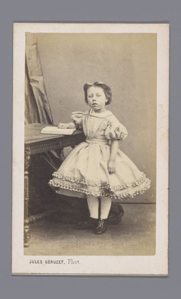 Curator: Well, hello there. What a charming, if somewhat melancholy, photograph. Editor: There’s definitely an air of Victorian solemnity about it. But something also playful? Curator: Indeed! This photograph, taken sometime in the 1860s by Pierre-Louis Pierson, is called “Le fauteuil,” which means “The armchair.” It's a portrait, obviously, and the work calls on the technical resources afforded by photography. And I do love the fuzzy, dream-like aesthetic it yields! Editor: That blurriness actually gives it such an ethereal quality. All of the frills and the heavy fabrics practically blend. It's quite an intriguing study in composition and texture, particularly the intricate layering of lace against the rich, floral brocade. Look at how the lines of the set direct the eye up. Curator: Absolutely. The child appears almost like a fairy-tale princess, trapped in this overstuffed world of velvet and lace. And look at those curls! I almost feel bad for the little darling...the hair, the flowers, the dress, it all feels too heavy and formal. She has that wistful, sort of melancholy expression common to the era...she embodies a certain constrained energy. What dreams might be buried under that beautiful, heavy gown, I wonder? Editor: It does make you question her agency, doesn’t it? Is she placed there as a prop? What narratives were intended versus what the image truly says. And then how the aesthetic elements are complicit in creating all this meaning... Curator: Precisely! These images were often charged with conveying social standing, family pride and maybe more subliminally, mortality. I can't help but wonder about her life outside this photographic moment. Was she happier playing in the garden or posing for portraits? Editor: That’s it precisely. Even in what seems static, still, like a fragment out of time, these historical images pose big and lasting questions!