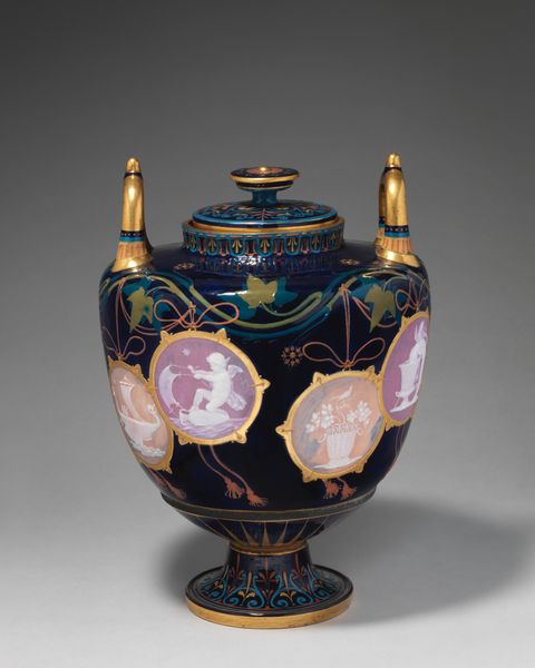 Editor: Right, let's discuss this ceramic stoneware vase crafted between 1882 and 1886 by Ernest Chaplet. The dark earthy colors with gold highlights and the floral and fauna motifs evoke a feeling of autumn to me, slightly melancholic. What story does this piece tell you? Curator: It's interesting you pick up on that feeling. Chaplet's work, including this vase, speaks volumes about the artistic dialogue between France and Japan during the late 19th century. There was a huge fascination with Japanese aesthetics, “Japonisme”, sweeping Europe. Consider how this vase challenges traditional Western ceramic practices, embracing instead the Wabi-sabi aesthetic. Editor: Wabi-sabi? Curator: Yes, it is a Japanese aesthetic that appreciates imperfection and transience. Observe the slight irregularities in the glazing and the asymmetrical arrangement of the decorative elements, rejecting the rigid symmetry often found in Western art. It reflects the philosophy of accepting the natural cycle of growth and decay. Editor: So, the vase isn’t just a pretty object. It's making a statement. It is using Asian artistic tradition as a counterpoint to more formalized European styles. Curator: Precisely! Museums at the time, and even today, played a crucial role in popularizing and, arguably, commodifying this “exotic” aesthetic. How do you feel that affects our reading of the work? Editor: It’s made me realize how tastes and our perception of art is so rooted in historical and social dynamics, especially through public exposure in institutions like the Met. The vase itself represents so much more than just decorative design. Curator: Agreed. Thinking about its place in shaping art historical movements is important, because, as you say, its social impact reaches beyond simple aesthetics.