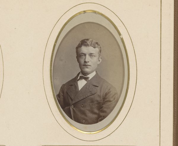 This photograph of a man, was created by Christaan Marcussen. The composition invites the viewer to engage with the subject through its tonal range and geometric layout. The almost square frame presents an image of a man with curly hair and formal attire. The neutral tones and the soft gradations of light create a sense of depth while maintaining a formal distance. The subject is placed centrally, and the oval vignette blurs the background which draws focus to the subject's face. Marcussen has achieved a balance between clarity and suggestion. The photograph uses the semiotic language of portraiture to convey status and identity. However, the softening of the image through the vignette opens up a space for subjective interpretation. This delicate equilibrium between the concrete and the abstract encourages us to look beyond the surface and consider the complex interplay of presence and representation.