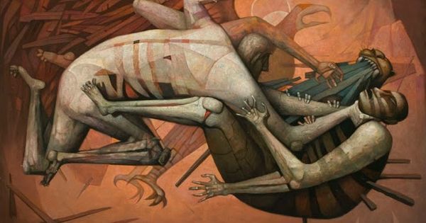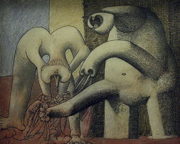 Editor: This mixed-media piece is titled "Vingt mille lieues sous les mers: Le combat avec le requin," or "Twenty Thousand Leagues Under the Sea: The Fight with the Shark," and it’s dated 1989 by Bernard Buffet. The angular figures and somewhat desolate underwater scene create a strangely theatrical feeling, don't you think? What do you see in this piece in terms of its broader social commentary, if any? Curator: It's important to consider that Buffet created this series illustrating Jules Verne's novel fairly late in his career, after a period where his work had fallen out of favor with many critics. Verne's narratives are very much about humanity's relationship with technology and nature. Notice how the divers are enclosed in these clunky, almost dehumanizing suits. How does this relate to our ongoing fascination and anxiety about technology and exploration? Editor: I guess I see your point, it almost creates a sense of alienation, of man versus beast. There’s a sort of absurdity in the drama. The divers appear awkward, more like automatons than heroic figures. Curator: Exactly. The drama highlights a theme in Buffet's late work and perhaps society: a certain disillusionment with progress and an awareness of its potential dangers. The 'heroic' battle feels staged, even futile. Consider the social context of the late 1980s - anxieties surrounding nuclear proliferation, environmental degradation, and economic disparity were rising. How might these fears have influenced Buffet's interpretation of Verne? Editor: So you're saying the piece reflects those anxieties by portraying this almost comical, yet violent, scene beneath the surface? Instead of being an exciting exploration of the deep sea, it becomes a metaphor for a darker, more troubled societal mood. Curator: Precisely. And the deliberately rough, almost primitive style of execution reinforces that sense of unease. Buffet seems to be questioning the very notion of heroic progress that Verne's novel initially celebrated. It makes one ponder who is being protected, who is attacking, and how the underwater ecosystem and our planet at large will react. Editor: I never thought about it that way before, seeing beyond the narrative itself, but looking at its historic impact as well as context really transforms my understanding. Thanks! Curator: My pleasure, this helps one observe the deeper societal significance behind visual drama and its purpose.