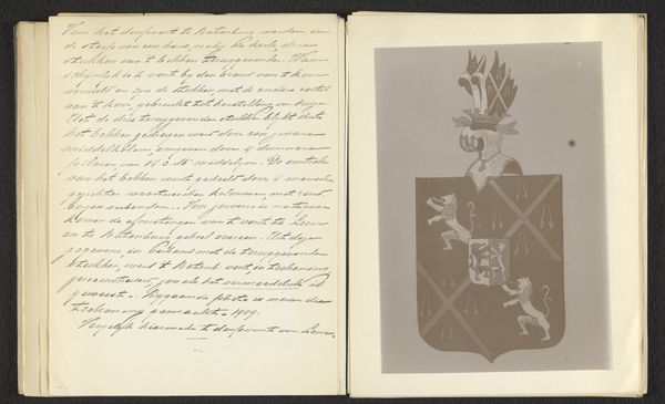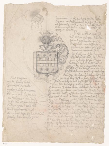 Editor: This is "Ex libris van Ludovico de Gobbis," an ink drawing and graphic art print created between 1904 and 1977 by Alberto Zanverdiani. It looks like it's from a personal sketchbook, with the main drawing surrounded by lots of handwritten notes. I’m struck by the contrast between the detailed drawing in the bottom left and the rest of the sketchbook's layout. What do you see in this piece? Curator: The work presents an interesting interplay of form and function within its visual structure. The central image, meticulously rendered in ink, immediately draws the eye. How does the density of linework contribute to your interpretation? Editor: It creates a real sense of depth in such a small area; the detailing contrasts so dramatically with the blank and handwritten spaces. How do you think the placement of the image, off-center on the page, affects how we read the overall composition? Curator: Indeed, that contrast creates a visual hierarchy. Note how the text surrounding it acts as a frame, both literally and figuratively. Are the formal qualities—line, shape, texture—telling a different story? Editor: I hadn’t thought of the text as framing, but now I see it. It's interesting how the delicate line work of the drawing, almost calligraphic in its intricacy, also connects it to the handwriting. Thanks! I've really appreciated learning how focusing on these elements changes the piece so much! Curator: The structure offers a lens through which we can understand this sketchbook as a composition. The deliberate juxtaposition invites us to decode the intrinsic qualities of this work and to appreciate its semiotic interplay.