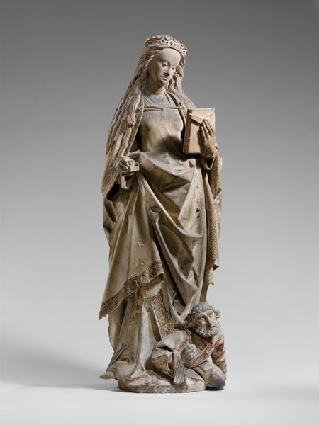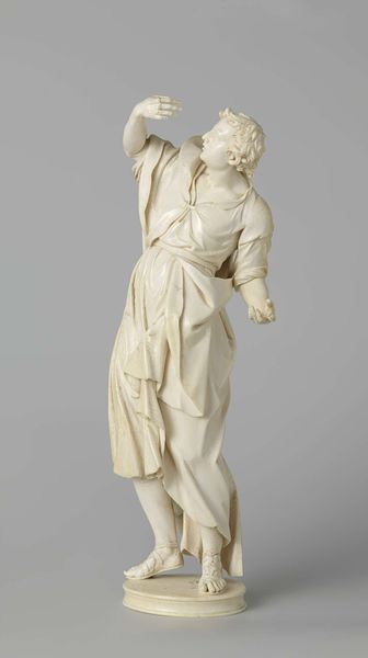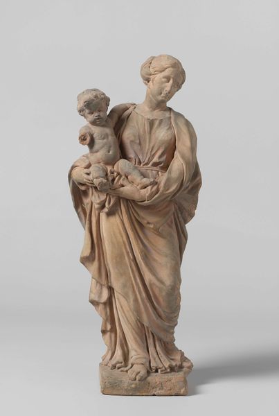 Frans Stracké created "Two Mothers" in the 19th century using plaster. The sculpture presents a vertical composition dominated by the figure of a woman holding a child. Notice the textured, almost rough surface of the plaster, which gives the sculpture a tactile quality. The woman's garments are draped in a way that creates folds and shadows, adding depth to the piece. The faces have a serene expression, evoking a sense of calm. Stracké masterfully uses the contrast between the smooth skin and the rougher fabric to draw the viewer's eye. The dog at her feet serves as a base. It also introduces an interesting element of domesticity. The upward gaze and the solid, grounded stance give the sculpture a monumental feel. Through his emphasis on material and form, Stracké invites us to consider the interplay between texture, space, and the human form.