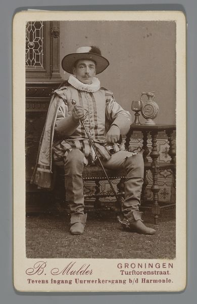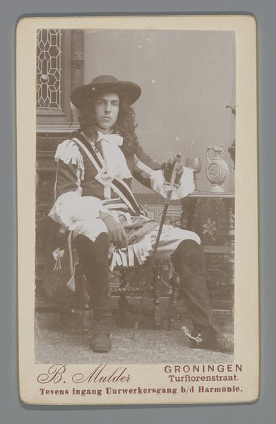 This is a cabinet card photograph of an unknown Groningen student in masquerade costume by Willem Bernard Bekkering. Dating from the late 19th century, the image provides insight into student culture and the performance of identity during this period. The student’s elaborate costume, complete with a feathered hat and decorative ruff, signals a deliberate construction of persona. This act of dressing up can be viewed as an exploration of selfhood, class, and social roles through the adoption of historical or fictional identities. The photograph, taken in a studio, adds another layer of artifice. The backdrop and props create a theatrical space, blurring the lines between performance and reality. The student's confident pose and direct gaze invite us to consider the performative aspects of identity and the ways in which individuals negotiate their place within society. In a time when social norms were often rigid, masquerade provided an outlet for self-expression and the temporary subversion of expectations. The photograph captures a moment of playful defiance and hints at the complexities of identity formation within the context of late 19th-century student life.