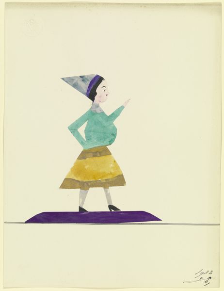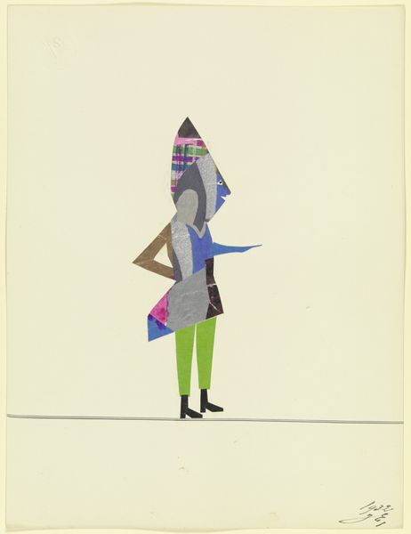 Editor: Here we have "16469," a 1932 collage, gouache, and drawing on paper by John Elsas, residing in the Städel Museum. I'm struck by its odd simplicity; the figure almost feels weightless despite its patchwork construction. What catches your eye? Curator: The application of form is compelling. Consider how Elsas utilizes various materials to construct a representational figure. Note the distinct textures, where patterned paper defines the head covering contrasting with smoother areas making up the figure's torso. It introduces a play of dimensionality despite existing on a two-dimensional plane. How do you read this arrangement? Editor: I find the flat perspective interesting, and the subject seems poised between solemnity and humor. The high contrast makes the figure really pop against the blank space of the page. Curator: Exactly. And this positioning? Semiotically, consider the single line the figure traverses; what implications arise from such deliberate placement? Further consider, how does the color interact to either deepen or disrupt perspective, say where green gives way to gray, how does the viewer interpret this shift? Editor: I suppose the line grounds it but also heightens that feeling of precariousness; there’s such minimal visual information, yet it’s somehow complete. Maybe that sharp juxtaposition of materials prevents the eye from resting. Curator: Indeed. By fragmenting form through collage and superimposition, a new symbolic register occurs, transcending simplistic representation and pushing toward a modern articulation of self and its instability. Editor: So it’s less about accurately depicting and more about the language of shape, texture, and even the implied space? That gives me a lot to consider about how artists use materials to convey ideas. Curator: Precisely. We find that a concentrated study of medium becomes a vocabulary of art and a doorway to better appreciation of Elsas.