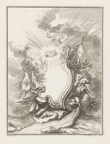 Curator: This engraving from between 1736 and 1762, currently held at the Rijksmuseum, presents a fascinating study in Rococo style, with an unknown artist depicting "Man en vrouw op rocaille." Editor: Well, my first thought is: what a whimsical perch! The figures atop that ornate swirl look like they're about to set sail on a confectionary wave. It has this almost playful absurdity. Curator: That "confectionary wave" you speak of is the rocaille—a quintessential element of the Rococo, mirroring a lighthearted retreat from the formal constraints dominant in preceding eras. Observe the delicate lines; the engraver beautifully captures its intricate detail. Editor: You’re right, the craftsmanship is remarkable, it's amazing how they created all those small features by hand, I can feel the labor and energy. And while you're noting societal shifts, that sun bursting forth certainly looks like a sign of optimism, maybe of new ideas emerging! Curator: It very well could. Historians have long discussed the Rococo as an artistic representation of emerging bourgeois culture. Here, the sun may not solely symbolize divinity but potentially, the Enlightenment—an appeal to reason that was so important at the time. Note also how the subjects' dress aligns with upper-class fashions of the period, broadcasting social status. Editor: I’m struck by how that man stares, like a figurehead guiding a vessel. Does this couple stand for something bigger, I wonder? That swirling design at the bottom might speak of societal tides or maybe emotional upheavals bubbling underneath all the glamour. Curator: These sorts of works indeed functioned as a medium to both reflect and subtly reinforce existing class hierarchies. To see their presentation against natural features and bright celestial events certainly infers a harmony between social status and a more powerful divine order, a political narrative as it is much an aesthetic one. Editor: Right, but for all its formal context, can’t we enjoy this scene simply for its fanciful beauty? Its balance, the dance of the lines, that sun. It does uplift something in me, even without a Ph.D. Curator: Indeed! Thank you, your poetic insight invites us to reconcile how the echoes of history shape our own personal experiences when face-to-face with a work such as this one. Editor: Agreed! Art is best when it gets your wheels turning and then lets your feelings take over. Thanks for unraveling a slice of history with me.