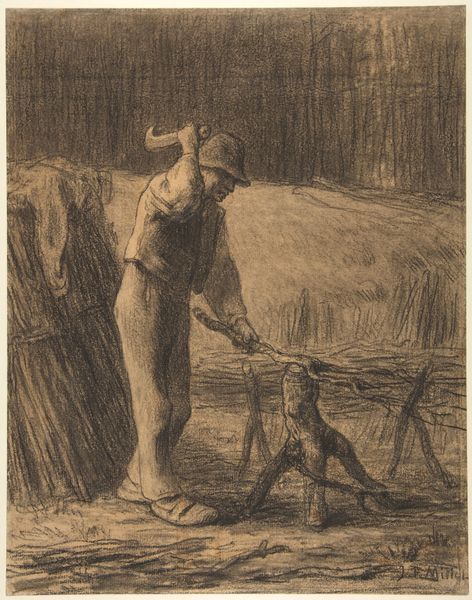 Alphonse Legros created this print, "Woodcutters," using etching techniques. The stooped figures of the laborers and the dense forest are powerful symbols that resonate deeply within the collective consciousness. Consider how this imagery echoes scenes of toil and struggle found throughout art history, from medieval depictions of peasants to Millet's paintings of rural life. The axe, a prominent tool in the scene, goes beyond its utilitarian function, becoming an emblem of human interaction with nature. Think of its earlier manifestation as a ritual object in ancient cultures, where it held symbolic importance in sacrificial rites or as an attribute of power. This primal connection to both creation and destruction lingers, charging the seemingly simple scene with layers of meaning. The posture of labor conveys an emotional state, a physical weight that communicates the hardship of human existence. The cyclical nature of labor and the symbols associated with it remind us of how certain motifs persist, transforming yet retaining echoes of their origins, engaging with viewers on a subconscious level.