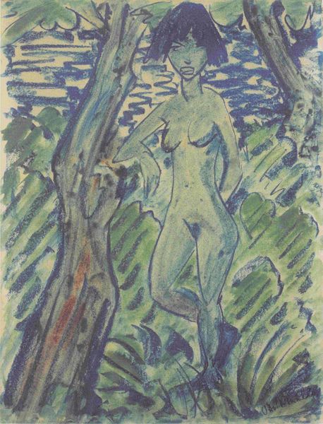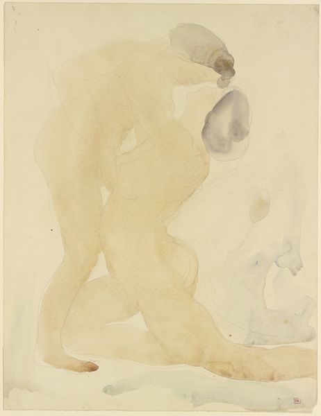 Curator: What strikes me immediately about this watercolour, “Kleine Johannes en Windekind” by Willem van Konijnenburg from somewhere between 1878 and 1887, is how ethereal it feels. It’s like stepping into a dream. Editor: Indeed. There’s a visual weightlessness achieved here through the artist's strategic use of line and wash. The composition, with its dominant vertical axis, guides the eye upwards, mimicking perhaps a spiritual ascent. Curator: Spiritual is a good word. I find a sense of childlike innocence in the figure. They are surrounded by these dreamy, oversized flowers. You know, I wonder if the unbound application of the watercolour medium enhances this dreamy quality for me; like memories half-formed. Editor: The 'Windekind' element, I imagine, further reinforces the ephemeral, almost allegorical subject position. Look at how Konijnenburg simplifies form. See the near-absence of strong tonal contrast—this creates an interesting sense of depth, a kind of flattened perspective typical of symbolic art. Curator: Precisely! Symbolism dances through this piece. The pale figure almost blends with the flowers, creating this sense of unity. What secrets does that sky hold? Is the character rising or falling? Is this the kind of Symbolism where forms aren't tied to reality as much as feeling, pure unadulterated expression? Editor: Perhaps. Though it is in the negative space—those pale blues and whites—that much of the expressive burden rests, if we are thinking formally. The washes create this boundless field. The figure, in its very liminality, gains meaning not through presence, but relative placement within that infinite field. Curator: Yes, it’s this interaction of the figure and that blue beyond which creates that space! Thinking of unbound watercolour, and thinking of the potential in its colour, maybe "liminality" suggests that potential itself – a figure becoming, blooming! Editor: Well said. Overall, Konijnenburg’s command of form is exceptional in illustrating the artwork's central theme of… potential, or perhaps just that single, transient, powerful movement. Curator: It reminds me that even the lightest brushstrokes can carry the weight of a whole world of feeling. Editor: A concise reading. I think this exploration suggests a richness even within seeming simplicity.