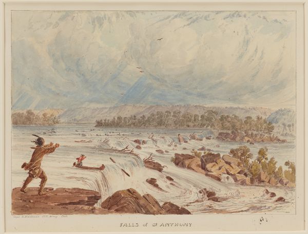 Curator: Look at the forceful drama of this piece; Georg Haas captured "Vue de la premiere chute d'eau de Tisteddal en Norwege", or "View of the First Waterfall of Tistedal in Norway," between 1788 and 1792. It’s a watercolour and aquatint print now held here at the SMK. The rush of the falls immediately pulls your eye. Editor: Absolutely, the water is quite striking. There is this romanticized scene unfolding but also clear depiction of the labor. What strikes me immediately is the delicate rendering. It almost seems at odds with the subject, given how immense the power of water must feel here. It's quite beautiful, a little dreamlike. Curator: I find Haas' choice of aquatint particularly fascinating in contextualizing this work. Think about the time; Europe was captivated by depictions of untouched lands, the rise of the picturesque and sublime. These scenes shaped perceptions and bolstered colonial narratives. Even a Norwegian waterfall becomes fodder. Editor: And here we have figures imposed upon that sublimity. Those crossing the bridge with horse and cart and others seated almost carelessly upon a rock… How do these subjects connect? Do they interact or simply exist together in the scene? It's difficult to reconcile this moment to a sense of scale. I am constantly working between their own actions and the context of the scene at hand. Curator: It is quite self-aware in that regard. Aquatint, specifically, allowed for tonal gradations that mimicked the atmospheric perspective, further enhancing this sense of distance and control over nature. The labor becomes picturesque against a scene of wonder. The industry balanced by the force of nature. I am always wondering if we romanticize history as it was being rendered then. Editor: Perhaps what we consider Romanticism itself comes to this balance you’ve described. An awe and an appropriation for what cannot be replicated. That question you’ve put out there asks: Has anything really changed, as far as human response goes? I think of eco-tourism and Instagram travel. New contexts with similar impulses, maybe. Curator: Indeed. The echoes certainly resonate. For me, revisiting this print, it highlights how even seemingly innocent landscape depictions are steeped in historical power dynamics. Editor: And for me, it's a reminder to consider the active role of the viewer – then and now – in shaping the meaning of such images. Thanks for this opportunity.