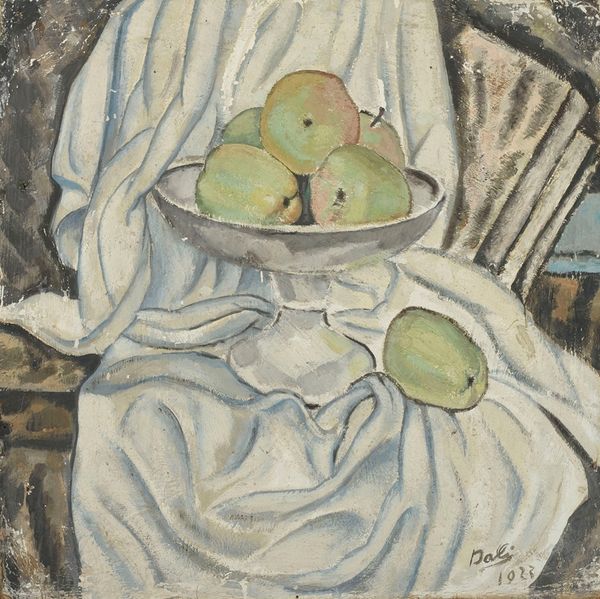 Editor: This is Juan Gris's "Still Life with Guitar," painted sometime in the 1900s. I’m struck by the muted palette and how the fractured forms feel both representational and abstract at the same time. What’s your take on it? Curator: I see a deliberate disruption of bourgeois realism, a commentary on representation itself. Gris dismantles the traditional still life, challenging the viewer to reconstruct meaning. The guitar, the fruit – are these symbols of leisure, pleasure, or something more subversive considering the political climate of the time? Editor: Subversive how? Curator: Well, consider the rise of avant-garde movements questioning established norms. Gris, like other Cubists, used fragmentation to mirror a world in flux, reflecting the anxieties and uncertainties of a rapidly changing society. It's not just a guitar; it's a shattered icon. Editor: That makes me rethink the whole composition. It's not just a still life, it's a statement! Curator: Exactly! Art became a tool, a voice amidst societal upheaval. Thinking about art this way really opens up new layers of interpretation.